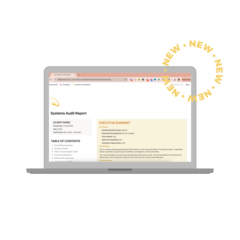 Nope! I work with whatever you've got. Notion, ClickUp, Asana, Trello, Monday, Airtable, Google Workspace, Flodesk, Mailchimp, Dubsado, HoneyBook, whatever. The audit optimizes YOUR tools. I'm not here to force you into my favorite software.
